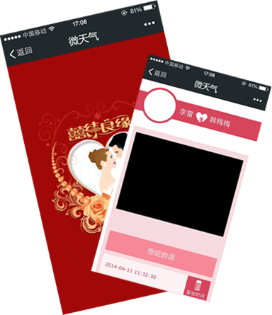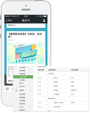 微生活提供微信公眾號自定義菜單管理功能,用戶無需再通過輸入關鍵詞觸發(fā)回復,直接點擊菜單就可以看相關的內容,微生活可與Wap進行打通,復用APP原有功能,同時可定制個性化功能、使用HTML5新技術進行無限拓展,幫助地方氣象部門打造最便捷、易推廣的微信內置APP,此功能如果結合微信3G網(wǎng)站可以使您的公眾號用戶體驗更好,帶給粉絲不一樣的感受。