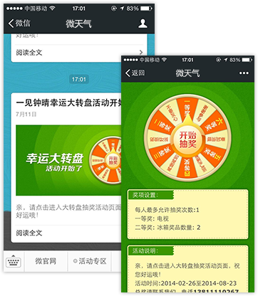 我們將利用微信的強交互性,讓您通過對互動流程、環(huán)節(jié)和方式的設計,運用各種設計活動從而實現(xiàn)與用戶的互動交流,整合系統(tǒng)互動符合微信娛樂性強的產品本質,用戶可結合自己的有效資源發(fā)起抽獎活動,以增加用戶黏性。